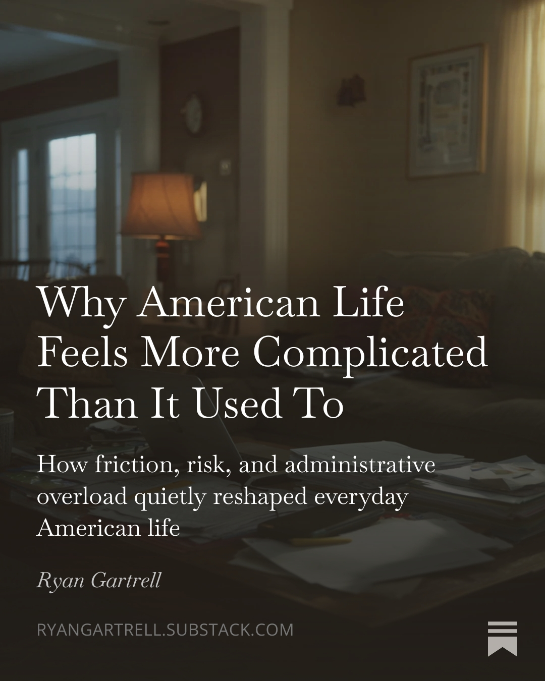 The problem is that modern American life is hard in a way that feels unnecessary. Hard in a way that does not obviously lead to better outcomes. Hard in a way that appears designed rather than inevitable.
